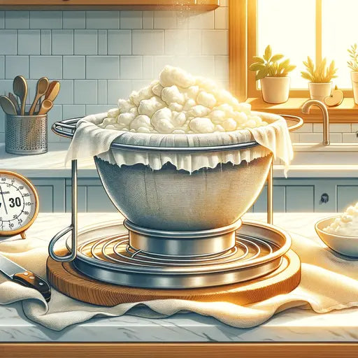 Den Quark 10-30 Minuten abtropfen lassen, abhängig davon, wie feucht oder trocken Sie den Ricotta bevorzugen. Für festeren Ricotta länger abtropfen lassen.