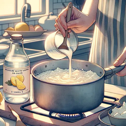 Den Kochtopf vom Herd nehmen und vorsichtig den Essig oder Zitronensaft einrühren. Ein- bis zweimal langsam und sanft umrühren, um zu kombinieren. Die Mischung wird gerinnen, da die Säure die Milch in Quark und Molke trennt.