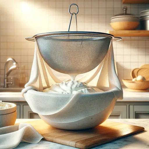 Das Sieb im Durchschlag in die Schüssel legen und mit dem Cheesecloth auslegen, dabei genug Tuch überstehen lassen, um die Quarkmasse später umhüllen zu können.