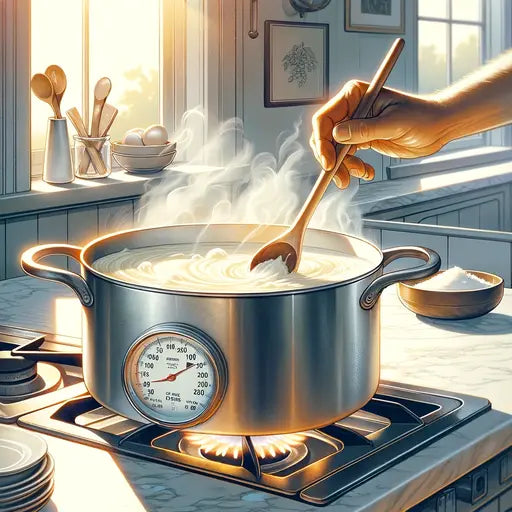 Milch, Schlagsahne (falls verwendet) und Salz im Kochtopf langsam auf mittlerer bis mittel-hoher Stufe erwärmen, gelegentlich umrühren, um Anbrennen zu vermeiden. Mit einem Thermometer die Mischung auf 88°C erhitzen. Ohne Thermometer die Mischung so heiß werden lassen, dass sie heiß ist, aber nicht kocht.